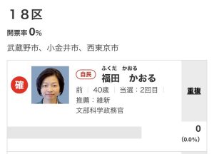 西東京市、武蔵野市、小金井市の東京18区からは5人が立候補、自民党の福田かおる候補が、NHKで午後8時の時点で早々に当確(いわゆるゼロ打ち)となりました。おめでとうございます。