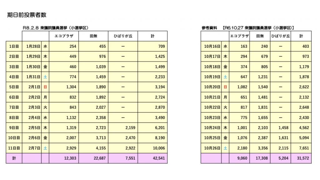 西東京市の投票率は60.88%でした。前回衆院選の投票率は58.47%だったので、2.41%の上昇となりました。また、西東京市の期日前投票者数は42,541人でした。前回の衆院選は31,572人でしたので、10,969人の増となりました。関心が高まることは歓迎すべきですが、長時間お待ちいただいた方もいると思います。期日前投票所の増、日程延長を市議会で訴えていきたいと思います。